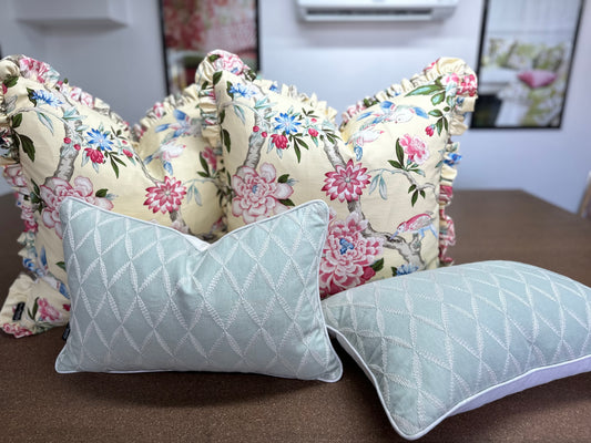Geo Leaf Lumbar Cushion | Etamine Embroidered Fabric with Linen Piping
