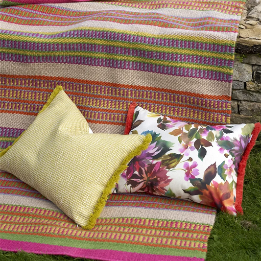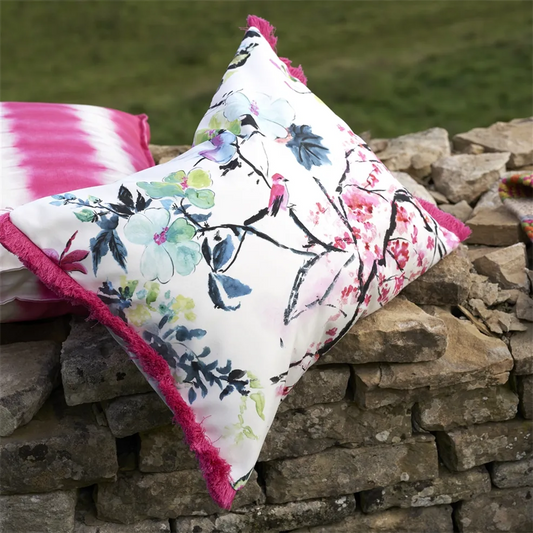 Manchu Outdoor Cushion | Painterly Floral Design with Coral Fringe