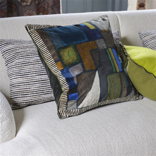 Sanzai Cushion | Graphic Striped Velvet with Indigo Blue Fringing