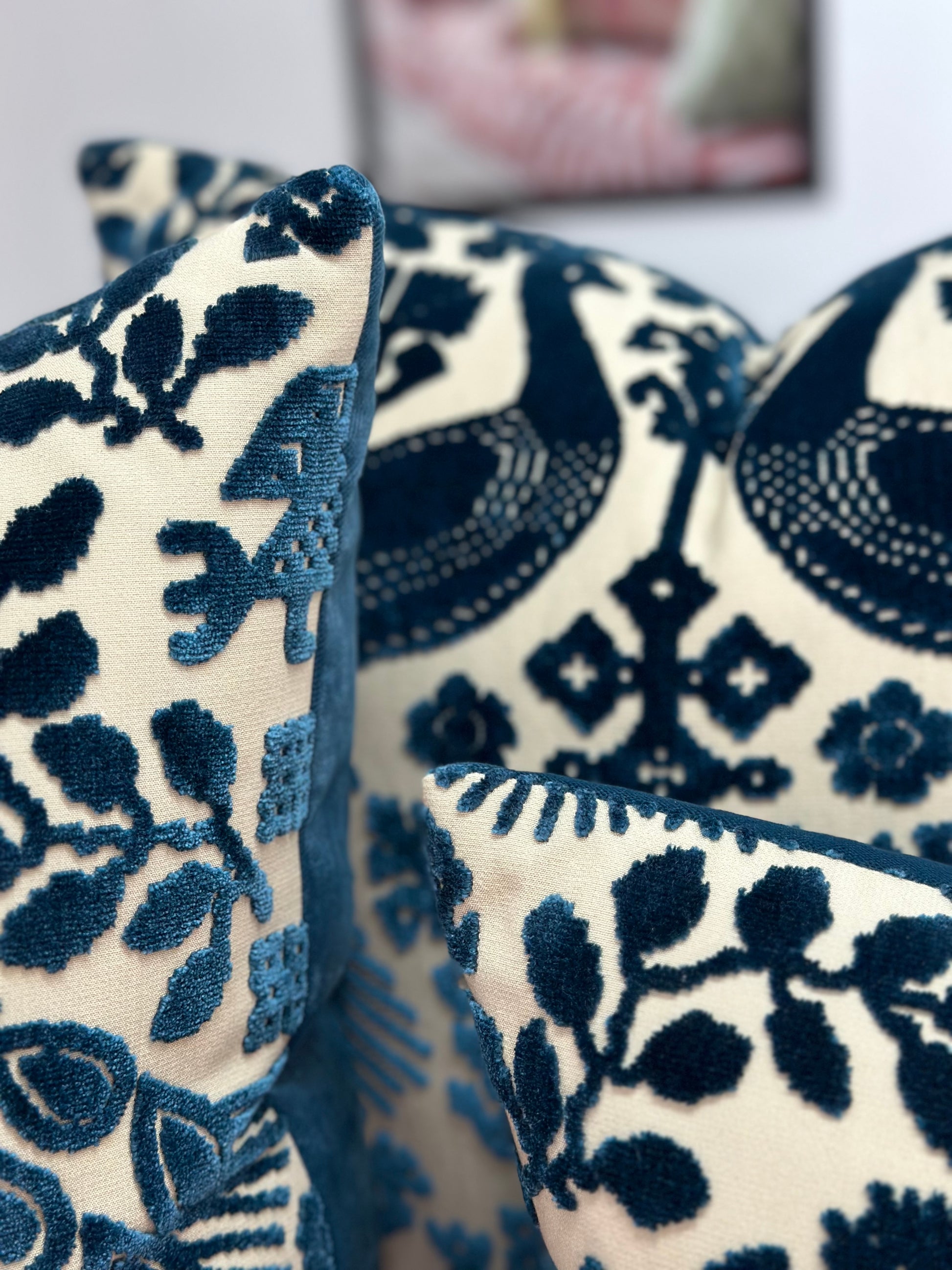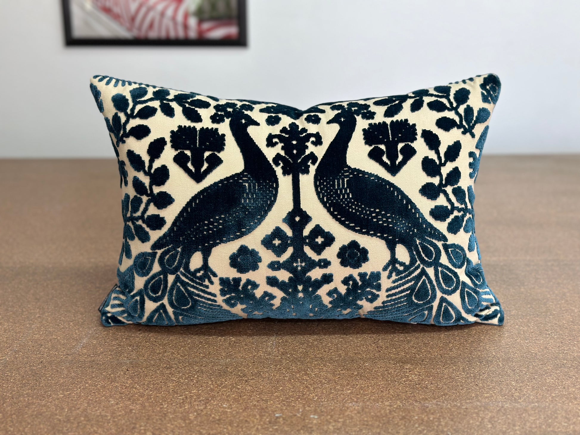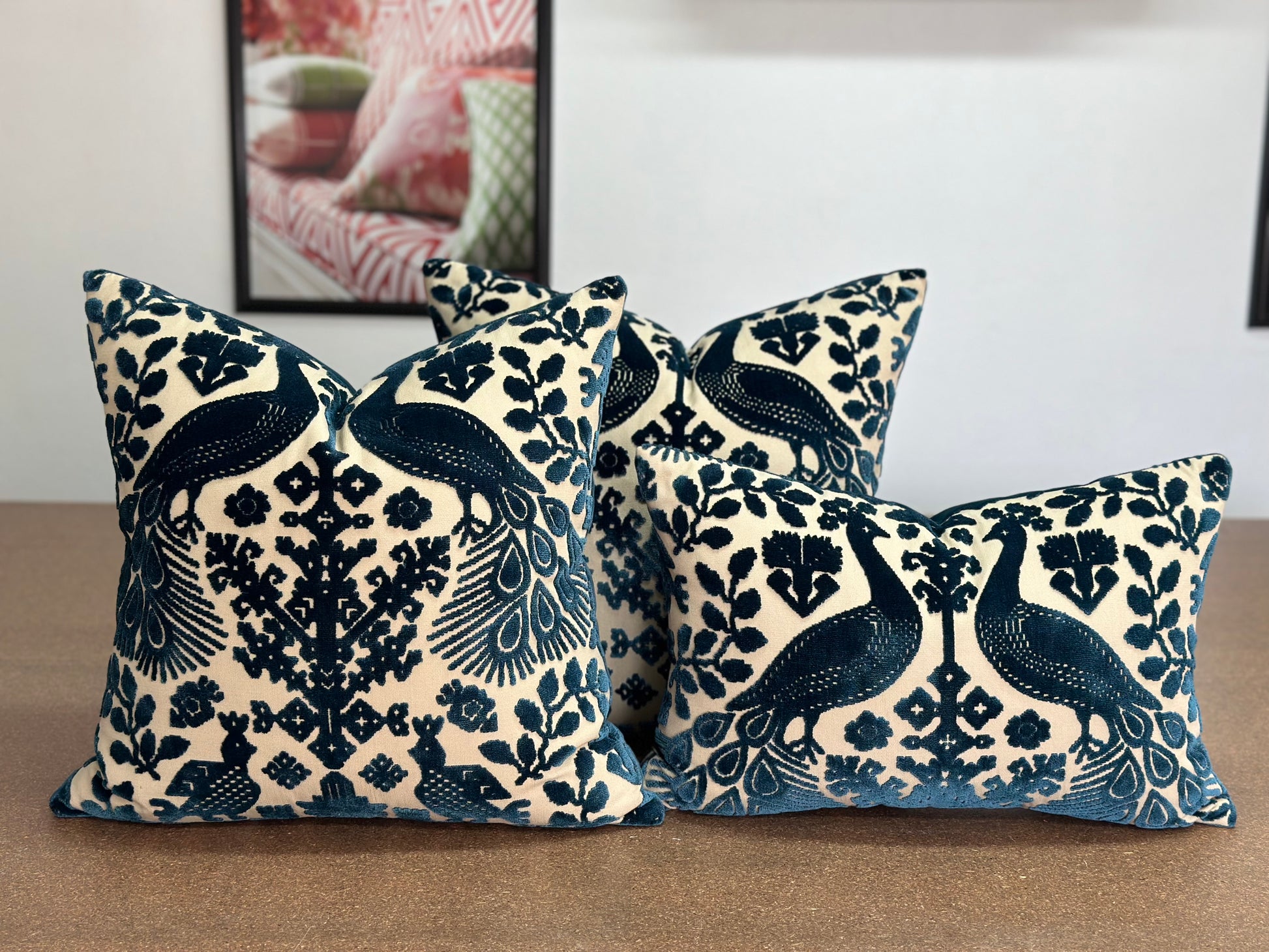 Elevate your interior design with these opulent cushions made from Schumacher's revered Pavone Velvet fabric.